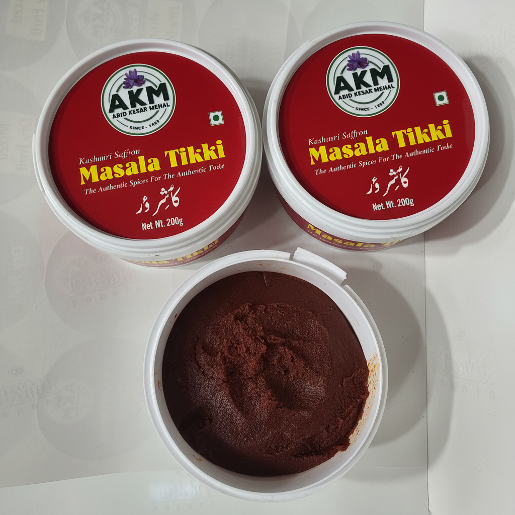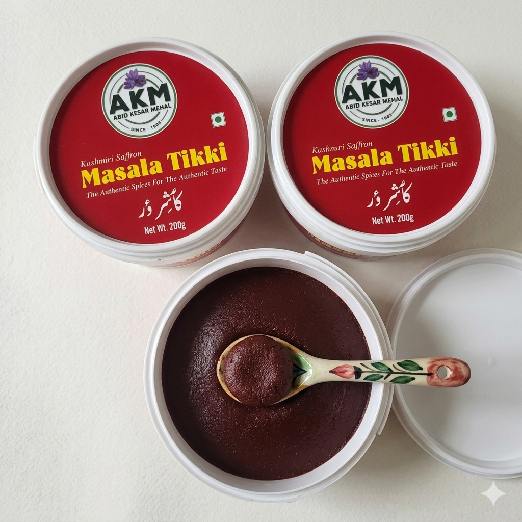 Kashmiri Saffron Masala Tikki. A unique blend of spices infused with Kashmiri saffron, crafted into a rich and flavorful masala tikki for a premium snacking experience.